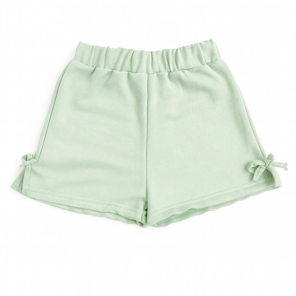 Descubrí el Short de Algodón Rústico Kid Girl Aplique Menta TEMP-2026, diseñado especialmente para las más pequeñas. Con un delicado detalle de tajo en los costados y un moño encantador, este short combina comodidad y estilo.